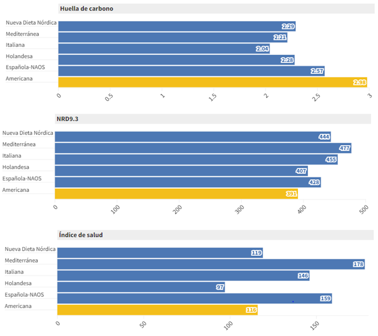 Por el contrario, la dieta norteamericana es la que presenta el mayor impacto ambiental. Los perfiles de emisiones de las dietas del Norte de Europa (Nueva Dieta Nórdica y guías dietéticas holandesas) fueron similares. Estos hallazgos se explican en base a las ingestas recomendadas de lácteos y carne, productos con elevada huella de carbono.
